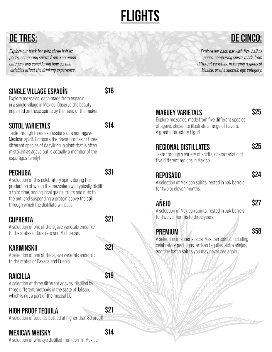 Arette Blanco or Rey Campero Espadin, Choice of Mexican Soad. Tequila $10/ Mezcal $12